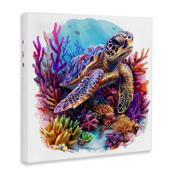 Turtle and Purple Coral by LSR Design Studio Unframed Animal Graphic Art Print 30 in. x 30 in.