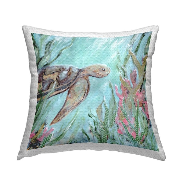 Underwater Turtle Seaweed Swimming Blue Square Outdoor Throw Pillow