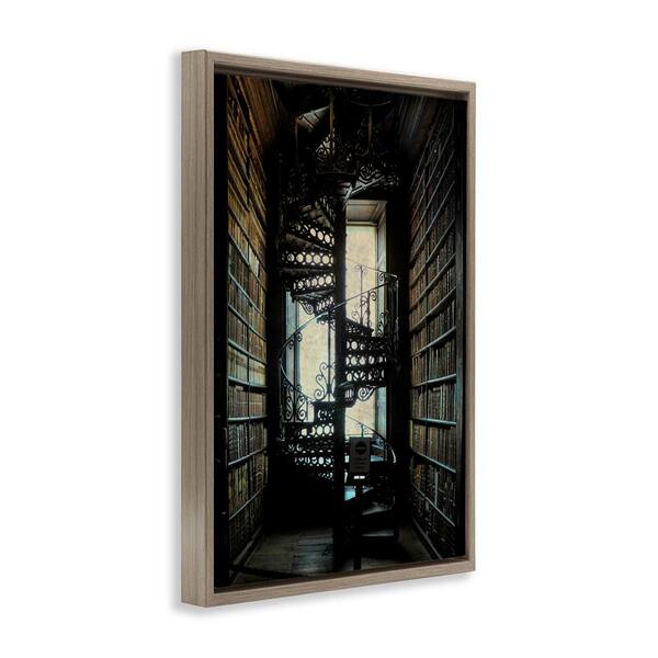 Vintage Library Spiral Stairs by Graffi tee Studios Brown Floater Frame Architecture Graphic Art Print 25 in. x 17 in.