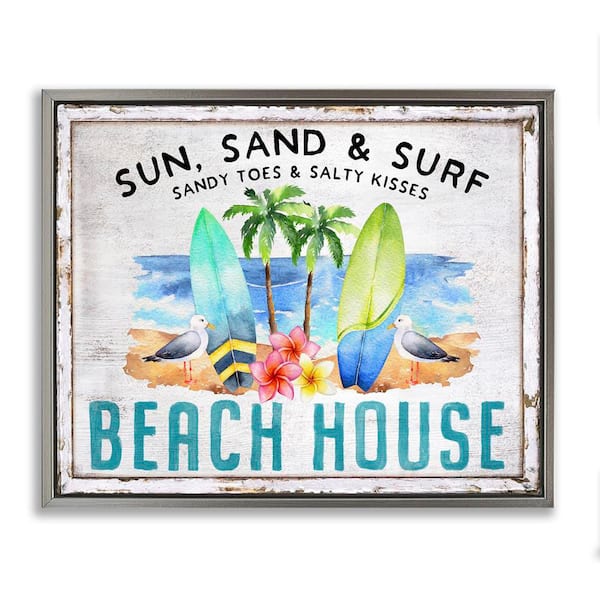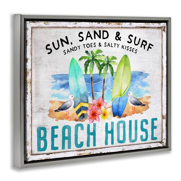 Vintage Sun Sand and Surf by Creatif Belle Gray Floater Frame Coastal Graphic Art Print 25 in. x 31 in.