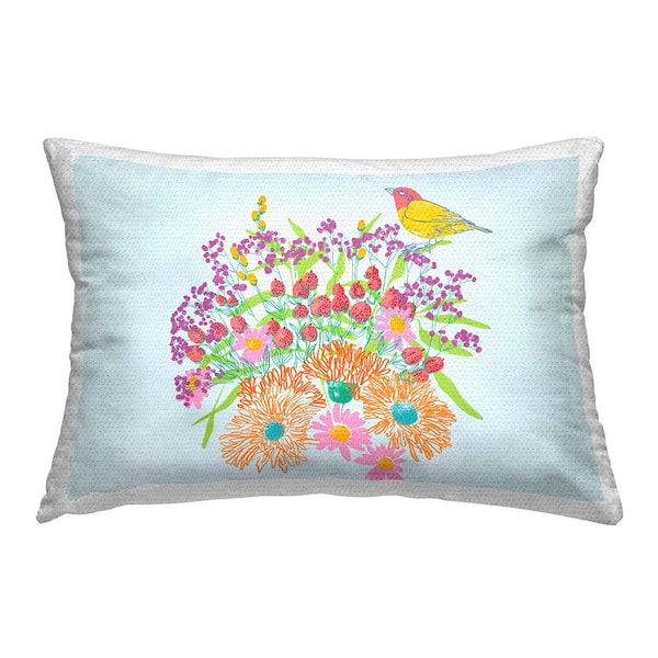 Vivid Blooms and Bird Blue Rectangular Outdoor Throw Pillow
