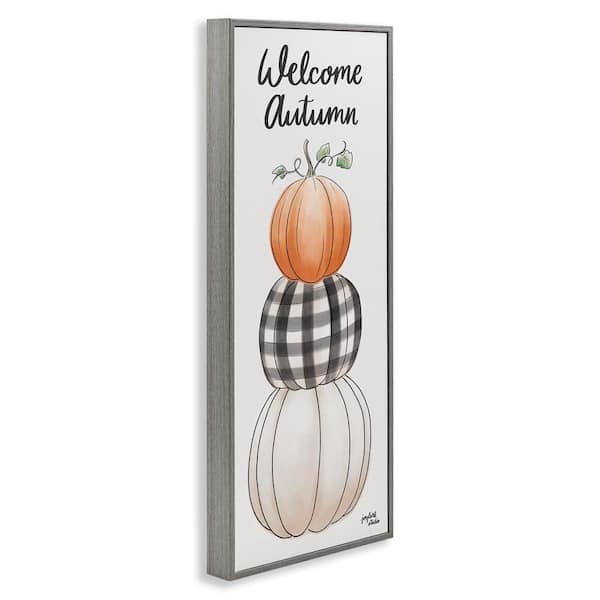 Welcome Autumn Seasonal Tartan Pumpkin Patterns by Jess Baskin Gray Framed Graphic Typography Art Print 10 in. x 24 in.