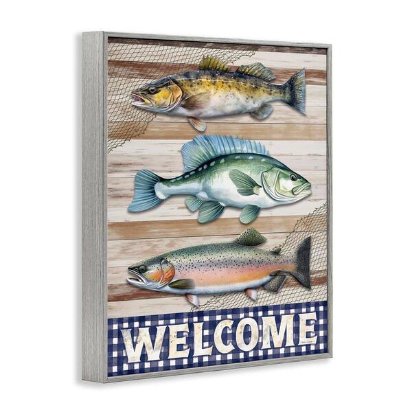Welcome with Rustic Fish by Nicole DeCamp Gray Framed Animal Giclee Art Print 30 in. x 24 in.