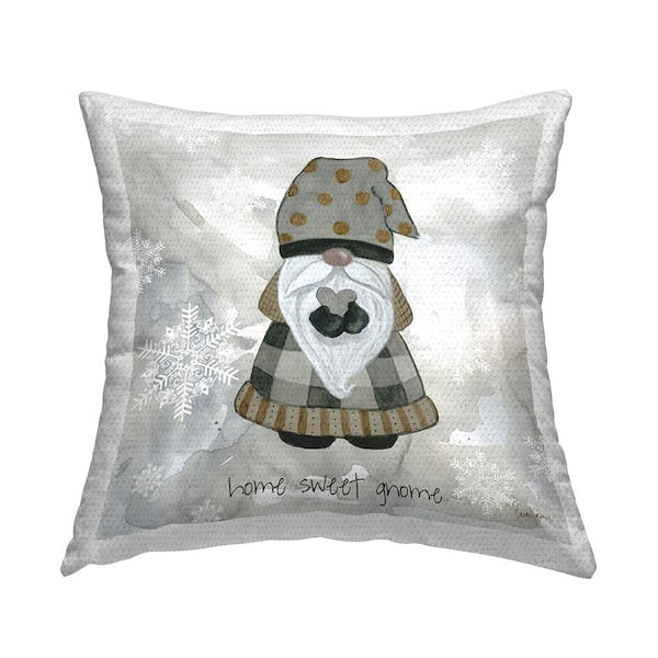 Welcoming Gnome Heart Seasonal Snowflake Pattern Grey Square Outdoor Throw Pillow