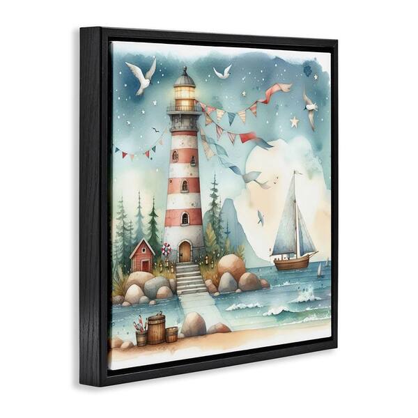 Whimsical Lighthouse & Birds by LSR Design Studio Black Floater Frame Coastal Graphic Art Print 25 in. x 25 in.