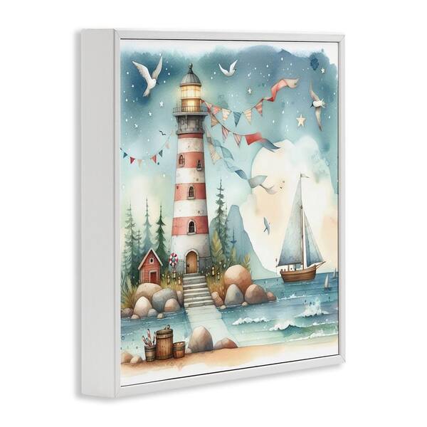 Whimsical Lighthouse and Birds by LSR Design Studio White Framed Coastal Giclee Art Print 17 in. x 17 in.
