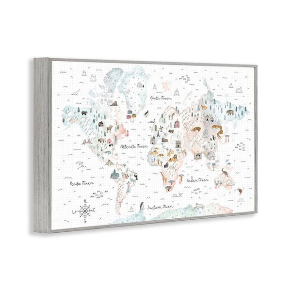 Whimsical World Traveler Map by Laura Marshall Gray Framed Animal Giclee Art Print 12 in. x 18 in.