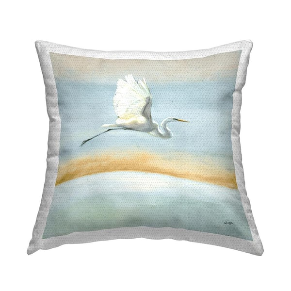 White Egret Bird Flying Over Ocean Shore Blue Square Outdoor Throw Pillow