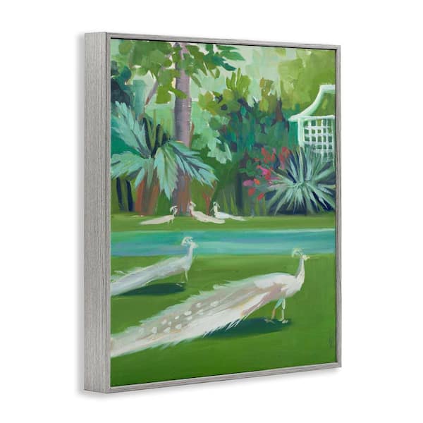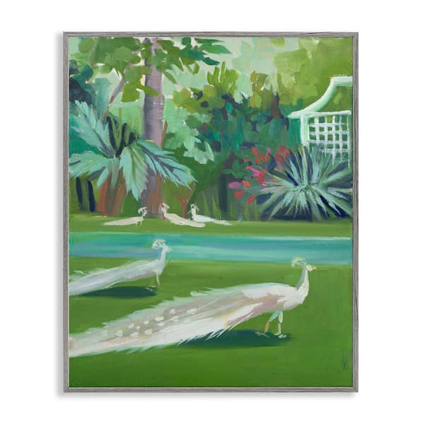 White Peacocks Scene by Jenny Westenhofer Gray Framed Nature Giclee Art Print 20 in. x 16 in.