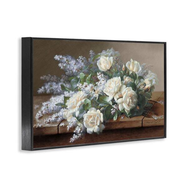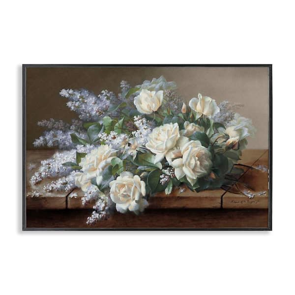 White Vintage Roses by Raoul De Longpre Black Framed Nature Giclee Art Print 16 in. x 24 in.