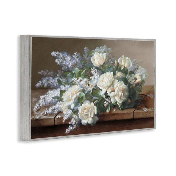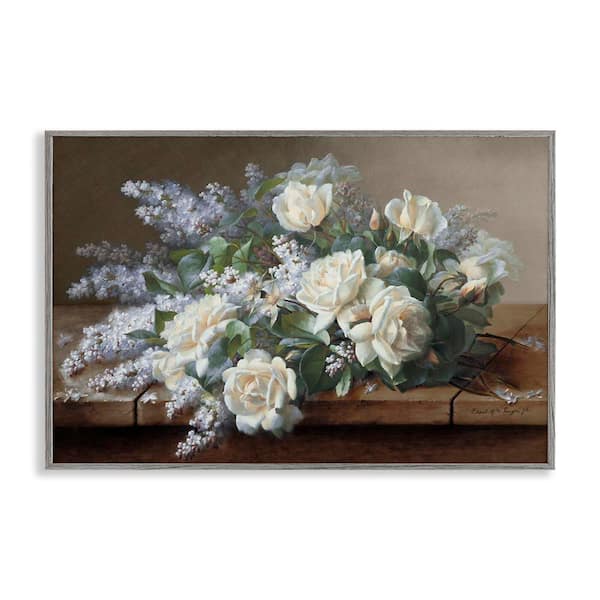 White Vintage Roses by Raoul De Longpre Gray Framed Nature Giclee Art Print 16 in. x 24 in.