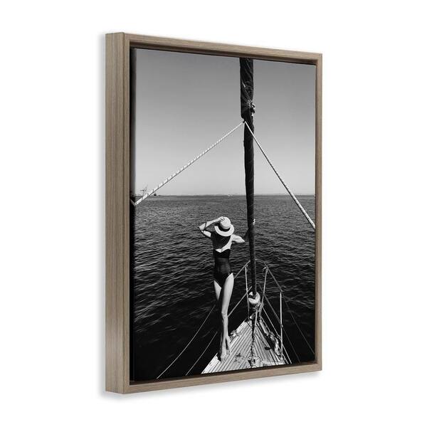 Woman Posing on Boat by LSR Design Studio Brown Floater Frame People Graphic Art Print 21 in. x 17 in.