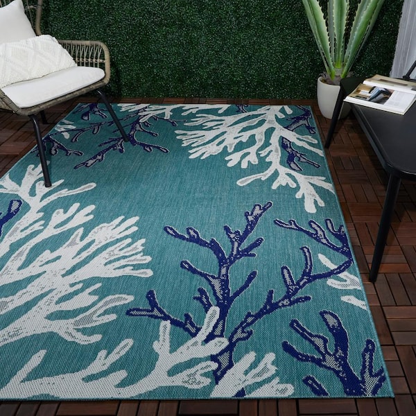 Teal/White 5 ft. x 7 ft. Coral Indoor/Outdoor Patio Area Rug