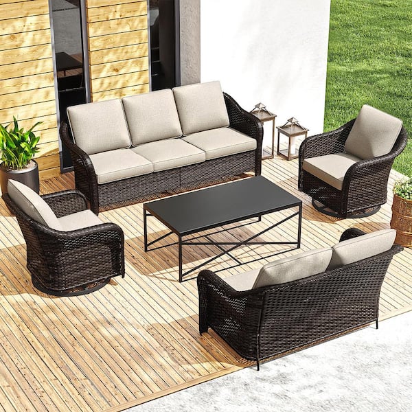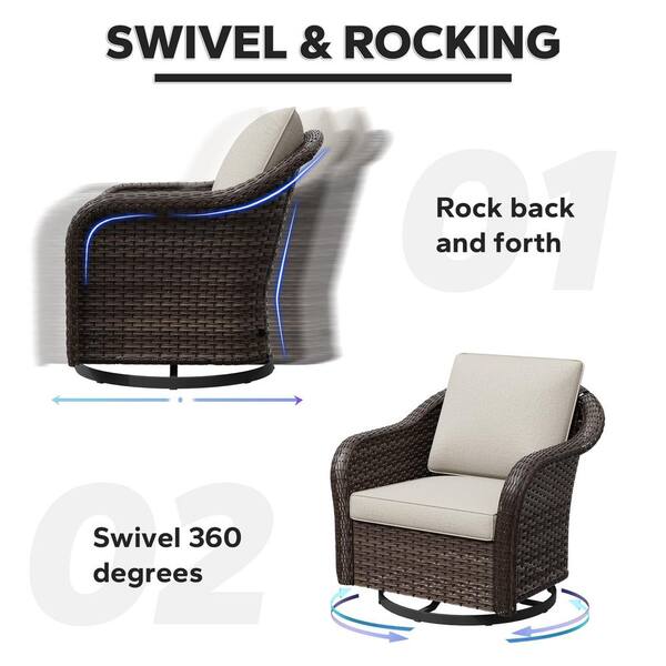 Stylish 5-Piece Wicker Outdoor Patio Conversation Set Deep Seating Set with Swivel Rocking Chair and Beige Cushion