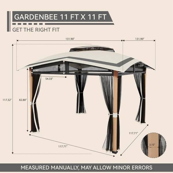 11 ft. x 11 ft. Outdoor Wood Grain Aluminum Patio Gazebo with Double Roof, Beige Canopy, and Mosquito Netting