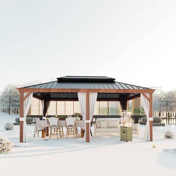 12 ft. x 16 ft. Black Double-Tier Hardtop Aluminum Gazebo with Galvanized Steel Roof Beige Curtain and Netting