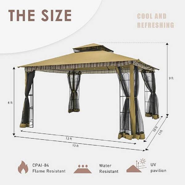 13 ft. x 11 ft. Beige Canopy Gazebo with Netting, Double Roof Canopy Shelter, Corner Frame Shelves for Backyard
