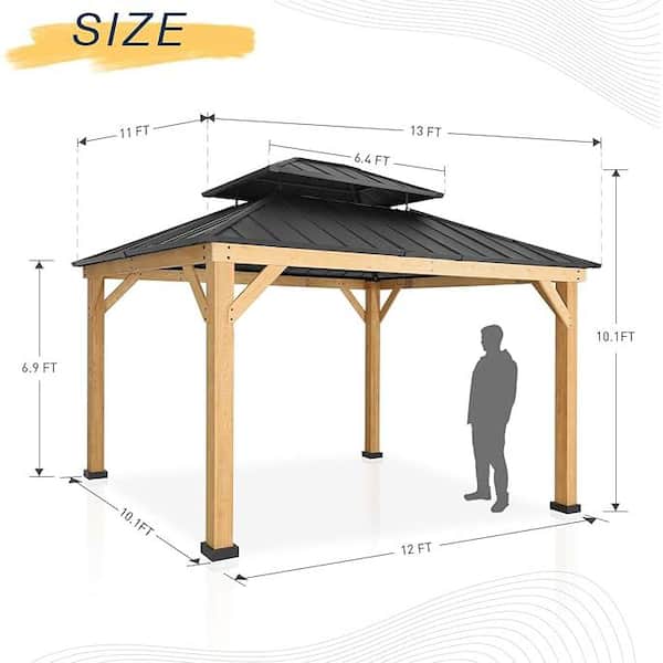 13 ft. x 11 ft. Black Wooden Hardtop Gazebo with Galvanized Steel Double Roof and Curtain Netting for Backyard