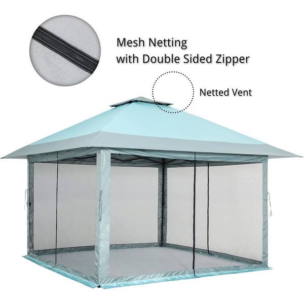 13 ft. x 13 ft. Blue Pop Up Canopy with Solar Lights, Mosquito Netting, Carry Bag, Sandbags, Stakes, Ropes