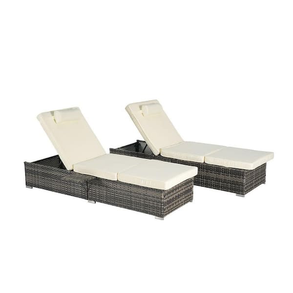 2-Piece Dark Gray Wicker Outdoor Chaise Lounge with Beige Cushions
