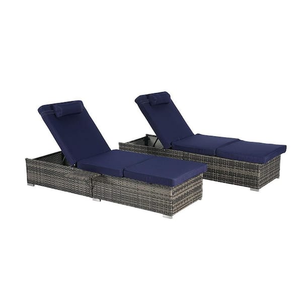 2-Piece Dark Gray Wicker Outdoor Chaise Lounge with Dark Blue Cushions