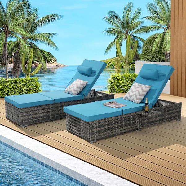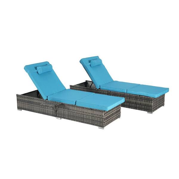 2-Piece Dark Gray Wicker Outdoor Chaise Lounge with Light Blue Cushions