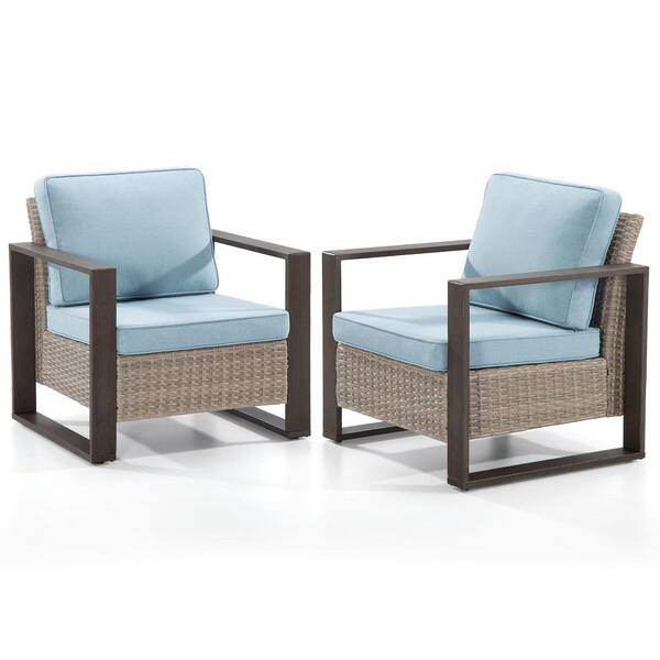 2-Piece Patio Wicker Outdoor Lounge Chair with Metal Frame and Light Blue Cushions