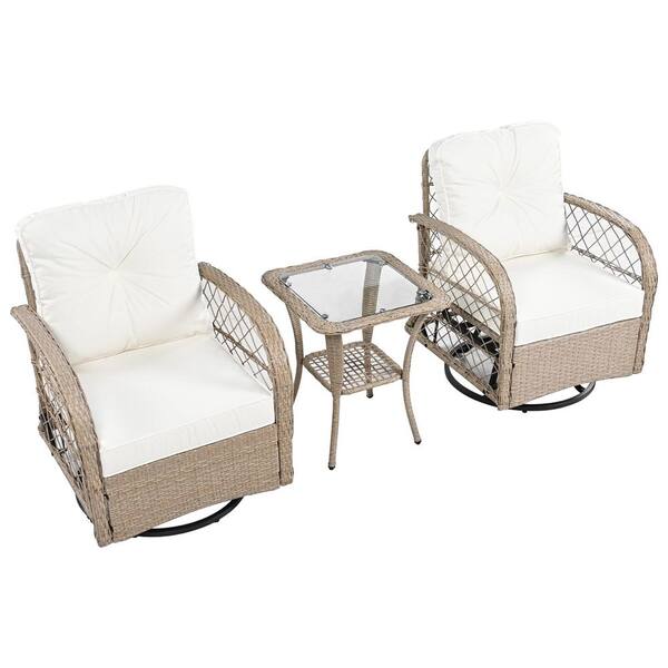 3-Piece Beige Wicker Patio Swivel Outdoor Rocking Chair with White Cushions and Table