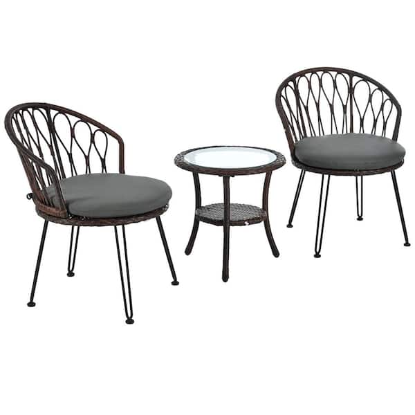 3-Piece Brown Metal Patio Conversation Set with Gray Cushions and Glass Round Table