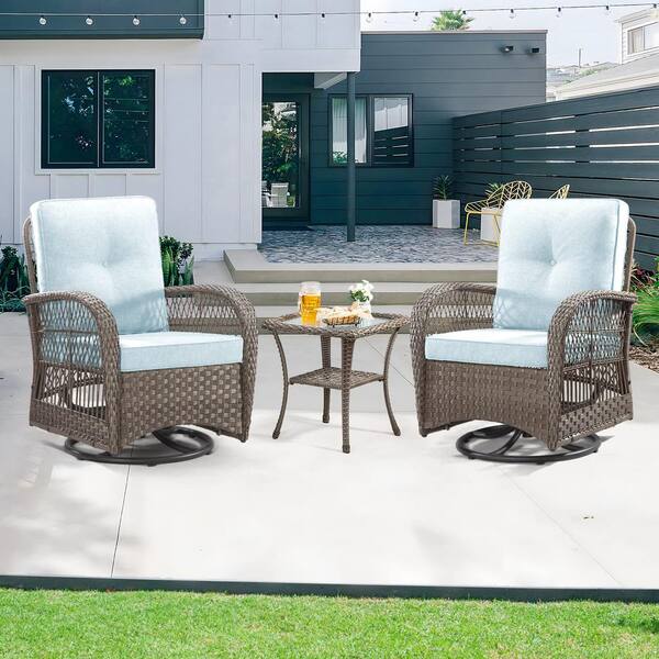 3-Piece Brown Wicker Patio Conversation Set, Rocking Chair Set with Light Blue Cushions and Coffee Table