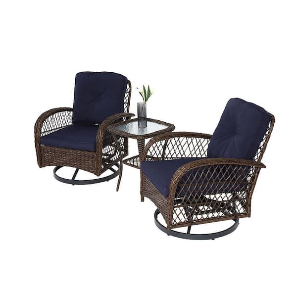 3-Piece Brown Wicker Patio Swivel Outdoor Rocking Chair with Navy Blue Cushions and Table