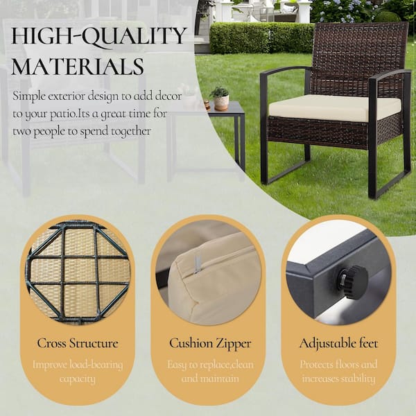 3 Piece Outdoor Brown PE Wicker Patio Conversation Set with Beige Cushions