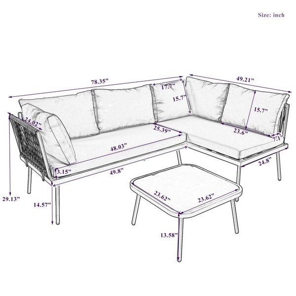 3-Piece PE Rattan Sofa Set All Weather Patio Metal Sectional Furniture Set with Beige Cushions