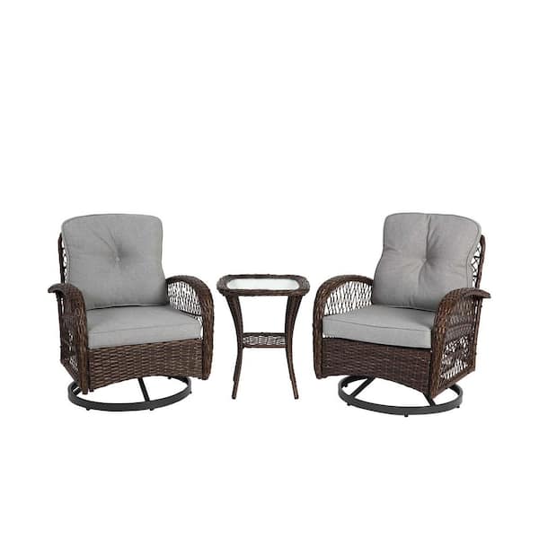 3-Piece Wicker Patio Conversation Set with Gray Cushions, Swivel Rocker Patio Chairs and Glass Coffee Table