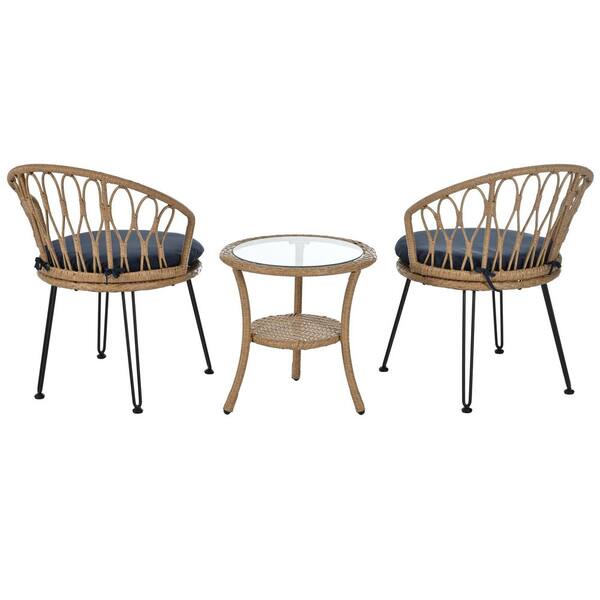 3-Piece Wicker Rattan Patio Conversation Set with Dark Blue Cushions, Perfectly Suited for Patios, Balconies