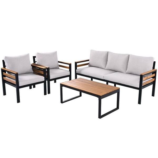 4-Piece Acacia Wood Outdoor Conversation Patio Furniture Set with Beige Cushions