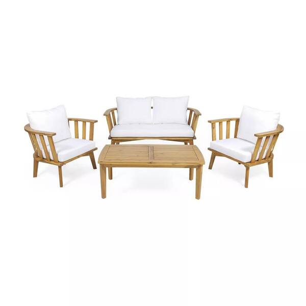 4-Piece Acacia Wood Outdoor Conversation Patio Furniture Set with White Cushions