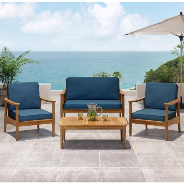 4-Piece Acacia Wood Outdoor Sectional Seating Set, Patio Conversation Set with Blue Cushions for Garden, Backyard