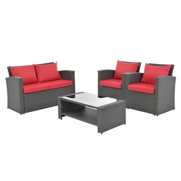 4-Piece PE Rattan Patio Conversation Set with Red Cushions