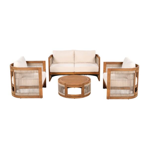 4-Piece Solid Wood Outdoor Conversation Patio Furniture Set with Beige Cushions