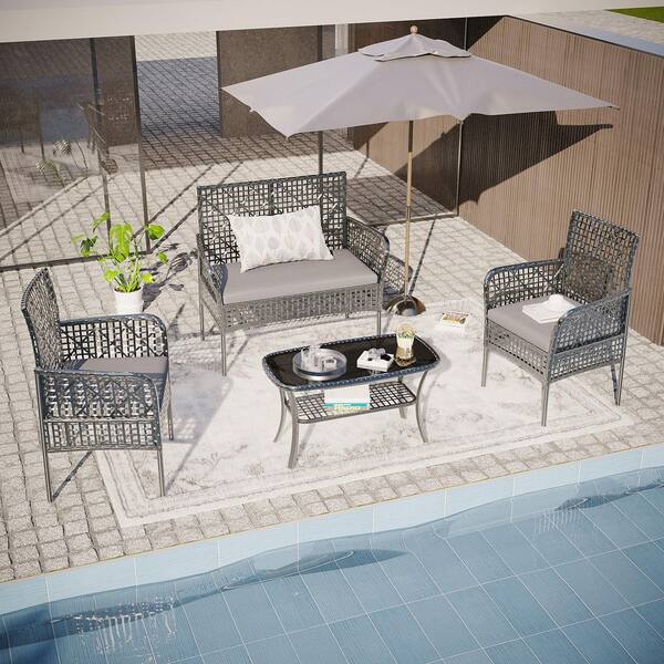 4-Piece Wicker Patio Conversation Set with Gray Cushions and Glass Coffee Table Suitable for Patio, Garden, Balcony