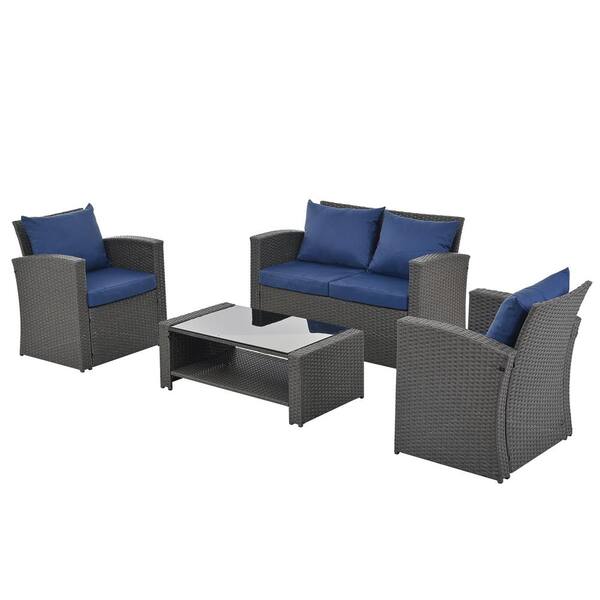 4-Pieces Outdoor Patio Furniture Set PE Rattan Wicker with Blue Cushions