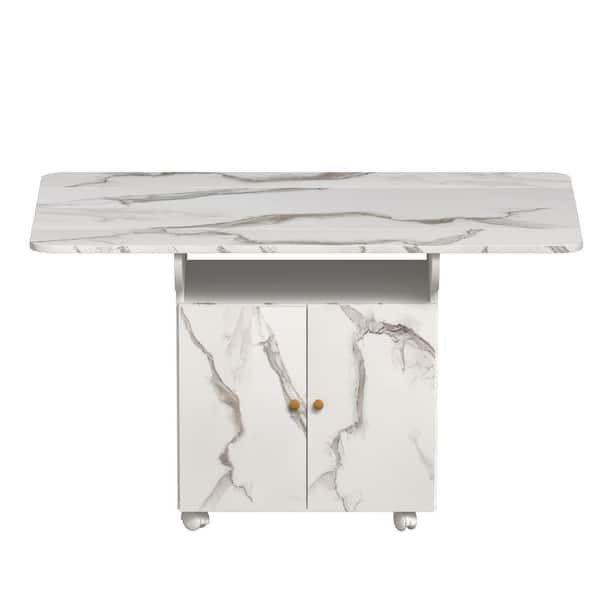 47 in. White Marble Wood Folding Dining Table with Storage Rack and Cabinet, Removable Entryway Table with 6 Wheels