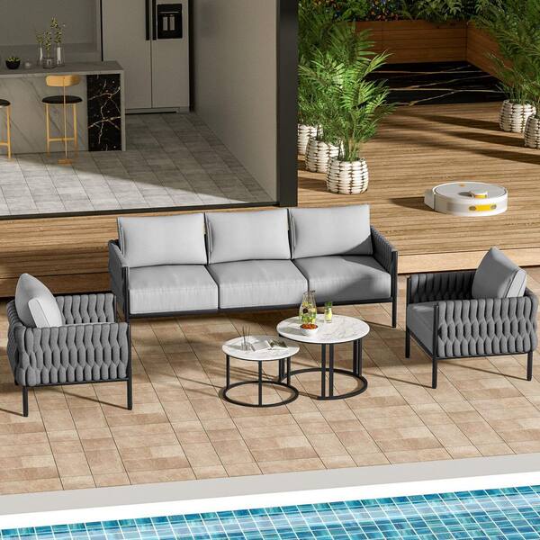 5-Piece Metal Outdoor Patio Conversation Set with Misty Gray Cushions and Two Round Coffee Table for Porch, Balcony
