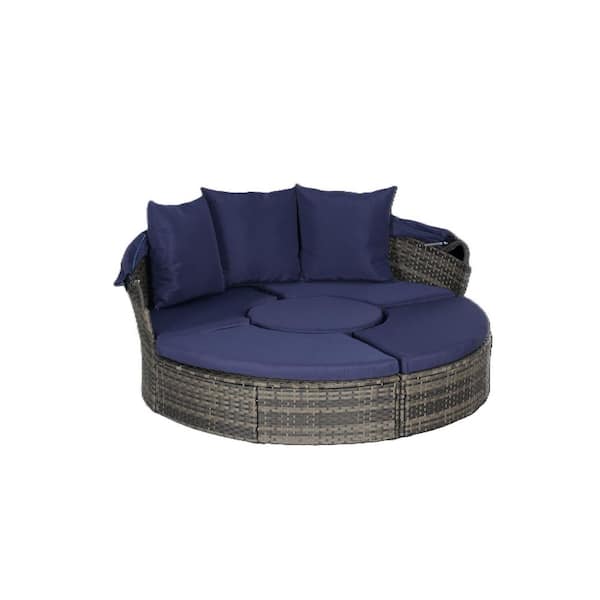 5-Piece Wicker Outdoor Day Bed with Dark Blue Cushions Retractable Canopy and Storable Table, Patio Round Daybed