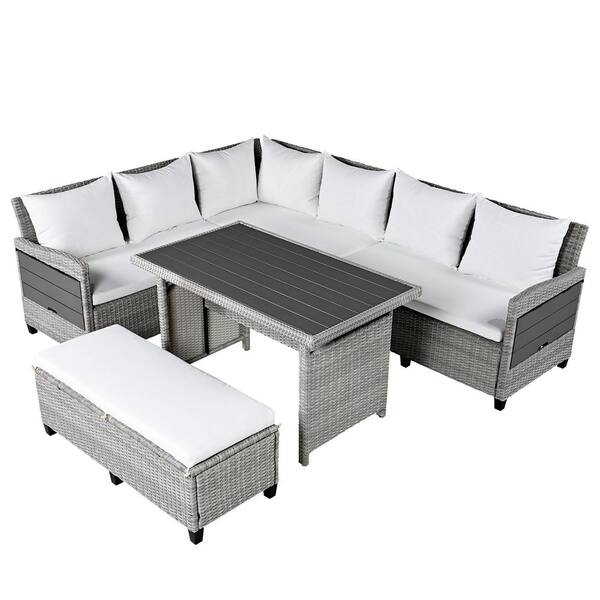 5-Piece Wicker Patio Conversation Set with White Cushions, 2-Extendable Side Tables, Dining Table and Washable Covers