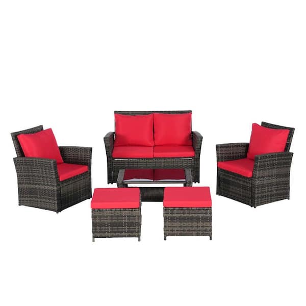6-Piece Gray Wicker Patio Conversation Set with Red Cushions, Ottoman & Tempered Glass Coffee Table