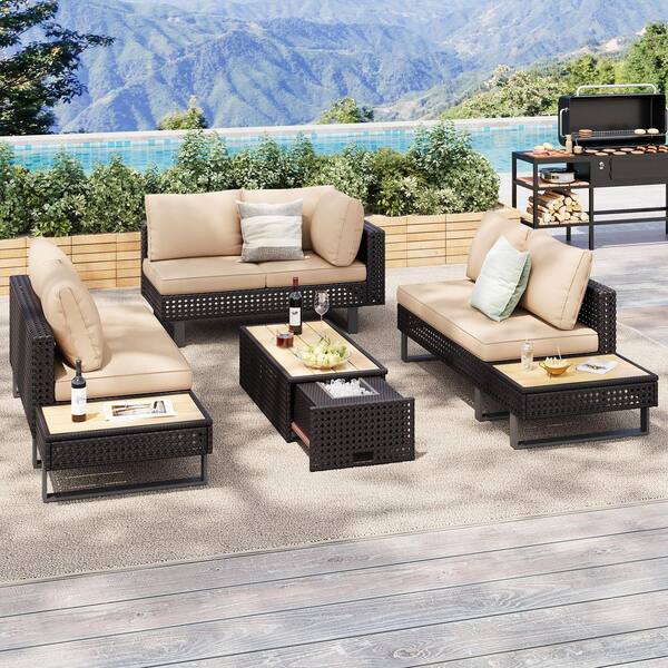 6-Piece Metal Patio Patio Conversation Set with Khaki Cushions, Extendable Coffee Table with Ice Bucket for Backyard