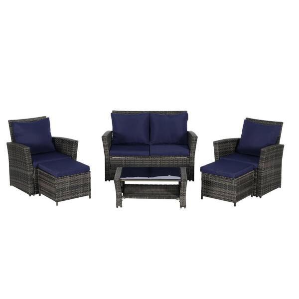 6-Piece Wicker Patio Conversation Set with Dark Blue Cushions, Ottoman and Tempered Glass Coffee Table