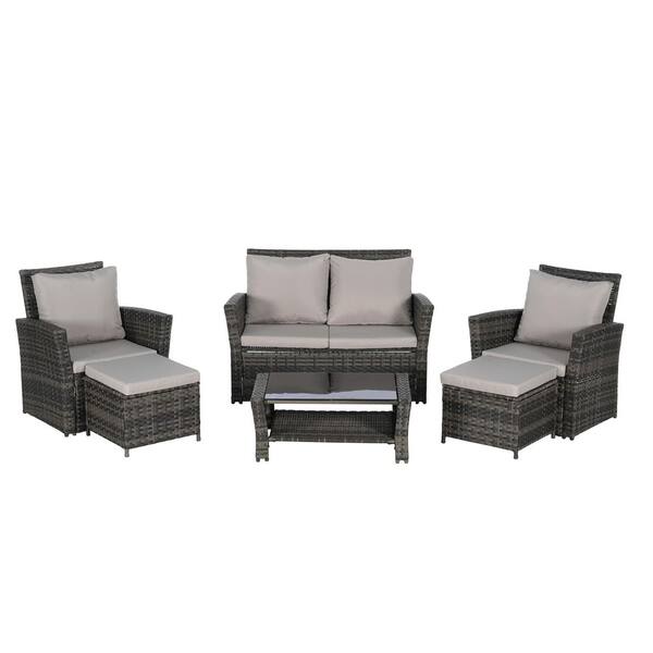 6-Piece Wicker Patio Conversation Set with Light Gray Cushions, Ottoman and Tempered Glass Coffee Table